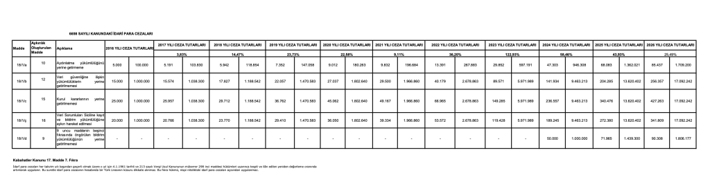 The Revaluation Rate determined annually by the Ministry of Treasury and Finance directly affects the lower and upper limits of KVKK administrative fines. The increase rate of 25.49% determined for 2025 serves as an indicator for 2026 projections. The financial risks that businesses may face show that even a simple negligence can lead to millions of liras in damages.